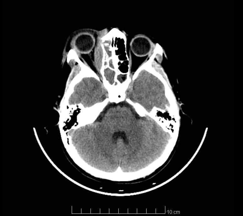 The probability diagnostic pleaded for preseptal cellulitis, infirmed by the CT test, which highlighted orbit cellulitis in association with maxilla-spheno-ethmoidal rhinosinusitis and brain abscess.