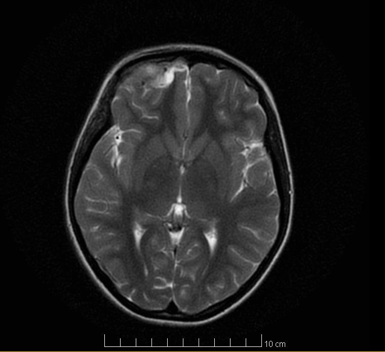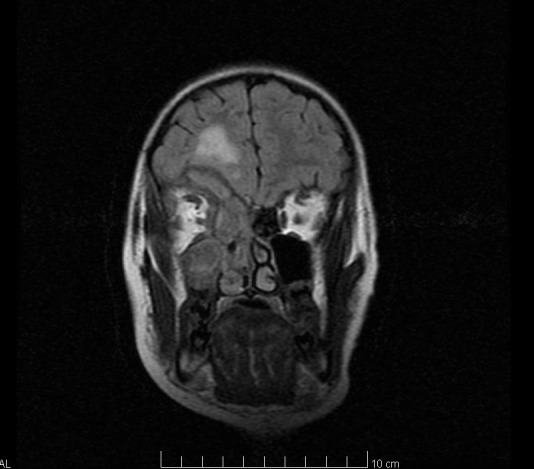 After 24 hours, the neurosurgical intervention was performed: frontal basal craniotomy with the excision of a grey-yellow purulent-granulomatous collection. Bacteriological test: E. Coli.