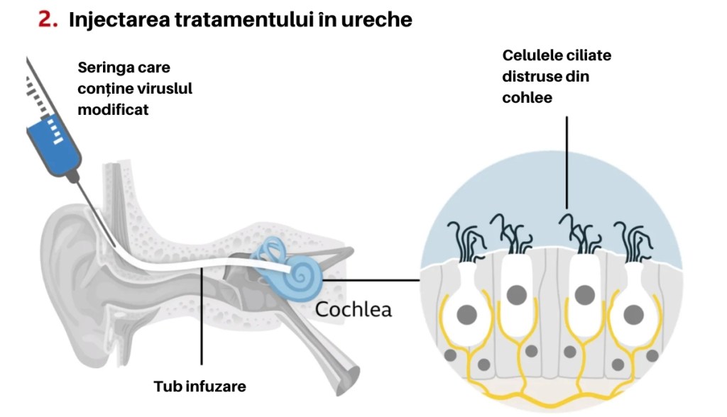 Această terapie revoluționară presupune administrarea în ureche, prin injectare, a unui tratament ce conține un virus modificat, cu ajutorul căruia se “transportă” la nivelul genelor o copie funcțională a genei Otof.